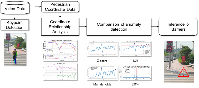 - Construction sites are high-risk environments where changing obstacles pose dangers of falls and collisions for workers. Traditional safety management, relying on visual inspections or wearable sensors, faces practical limitations such as equipment costs and worker resistance. To address these issues, this study proposes using existing CCTV infrastructure and video-based keypoint detection technology to detect walking abnormalities. We define the spatiotemporal correlation between the left and right ankle coordinates as a feature and compare the performance of four anomaly detection methods (Z-score, IQR, Mahalanobis Distance, LSTM Autoencoder). The results show that statistical methods often produce false positives due to a lack of temporal context, while the LSTM Autoencoder model performed best with an F1-score of 83.1%. This study demonstrates the feasibility of building an intelligent safety management system that identifies potential walking hazards through video analysis alone, without additional equipment.